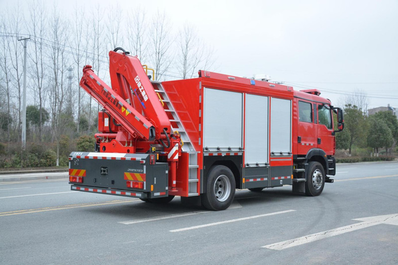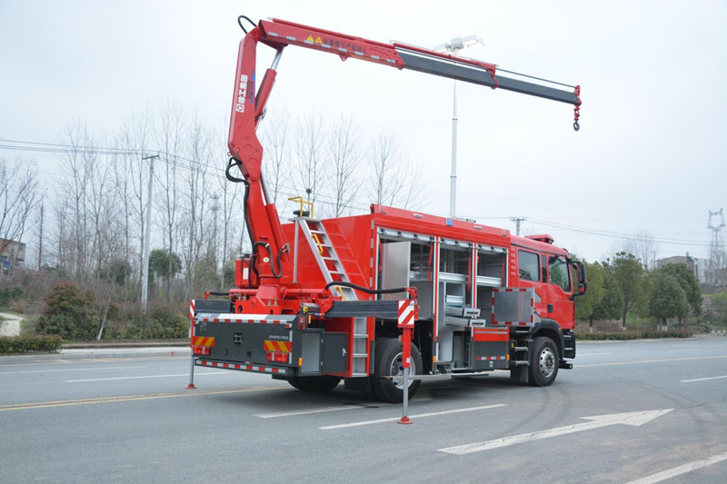 江特牌JDF5130TXFJY90/Z6 搶險救援消防車,整車主要由中國重汽汕德卡底盤、鋁合金上裝廂體、電源保障系統(tǒng)、隨車起重折臂吊機、高桿照明系統(tǒng)、車載電臺、器材艙、器材架、平式/立式拓展板機構、卷簾門、梯臺、扶手及護欄、警燈警號、隨車器材及其他附屬設施等組成。整車改裝后載荷分配均勻,質心位置和穩(wěn)定性計算精確,內部空間布局合理,能充分滿足應急救援工作需要。